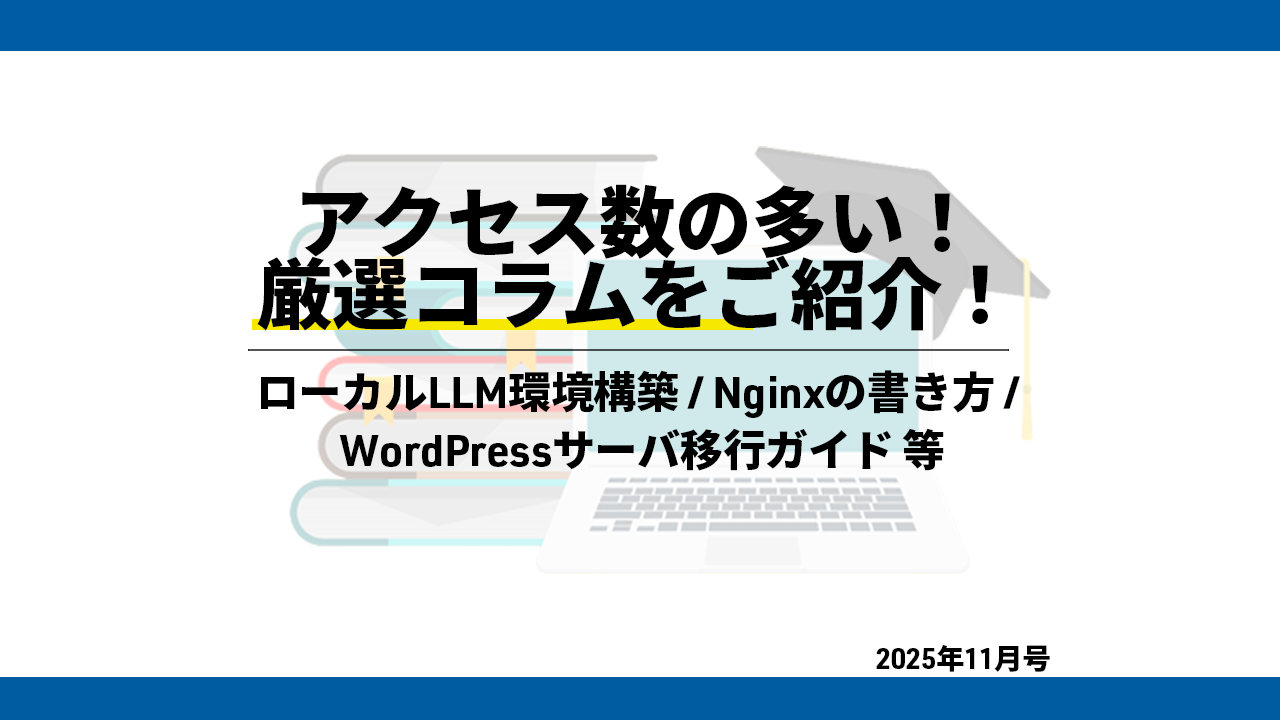 ローカルLLM環境構築 / Nginxの書き方 / WordPressサーバ移行ガイド 等 アクセス数の多い人気コラムをご紹介!