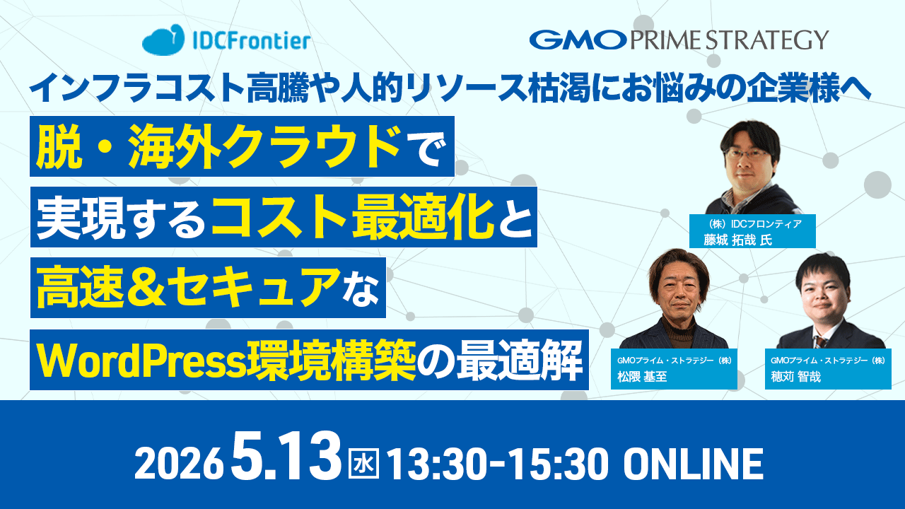 【5月13日開催】 【インフラコスト高騰や人的リソース枯渇にお悩みの企業様へ】 脱・海外クラウドで実現するコスト最適化と、高速・セキュアなWordPress環境構築の最適解