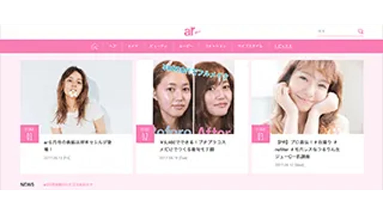 「ar web」は「おフェロ」や「雌ガール」などトレンドワードを発信する雑誌「ar」のwebマガジン。ヘアカタログやメイク、ボディケア、ファッションなど、女の子の気になる記事や動画が満載、読者に嬉しいプレゼントやイベント情報、モデル撮影の裏側も公開しています。