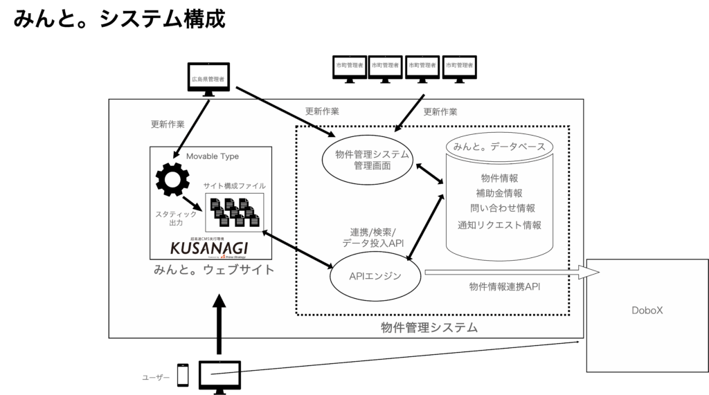 Movable Typeの作り込みによって、読み物記事や情報発信記事はノーコードでも更新できるようにしたという。また、フロントのMovable Typeと物件管理システムは、すべてAPI連携で開発し、デザイン性や簡易な情報発信、高度な検索機能を両立している。物件データの管理は、一括入力できるような仕組みを持たせるなど更新のしやすさに配慮し、さらに、市町村の担当者に部件更新権限のあるアカウントを割り当てることで、担当者負担の軽減、物件数の増加につなげている。