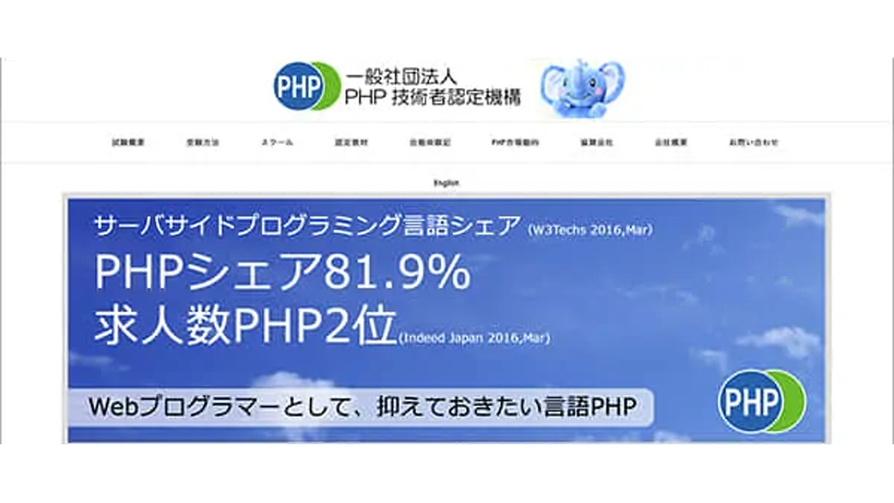 Webサーバで8割以上の言語シェアを持つPHPのスキルチェックをする認定試験の運営団体です。株式会社オライリー・ジャパン、ニフティ株式会社、日本マイクロソフト株式会社、NTTコミュニケーションズ株式会社の特別協賛により運営されており、全国100か所の試験センターで通年受験ができます。
