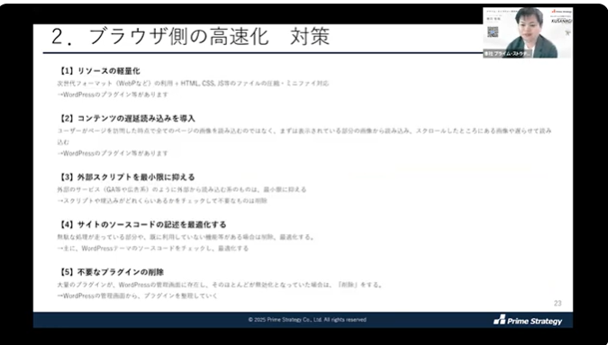 では、具体的にどこから手をつければいいのか。セミナーでは「サーバー側(バックエンド)」と「ブラウザ側(フロントエンド)」の2つの視点から、5つのステップが紹介されました。 いくつか抜粋して紹介します。