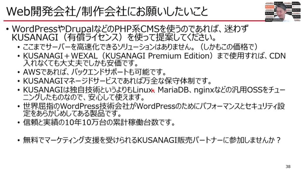 そして、Web開発会社/制作会社の皆様には、「WordPressを260倍高速にするKUSANAGI」をお試しいただきお客様へのご提案につかっていただければなと思います。