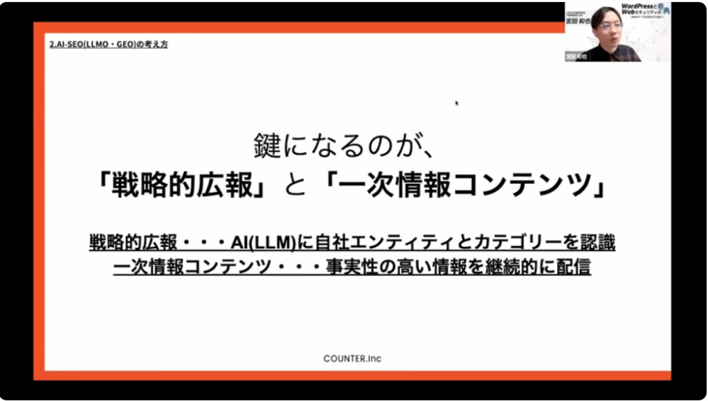 こちらは、プライム・ストラテジーの大規模セミナー「WordPressとWebセキュリティの祭典 『KUSANAGIサミット 2025』 ~WebマーケはSEOからAIOへ~」内でのセッションです。