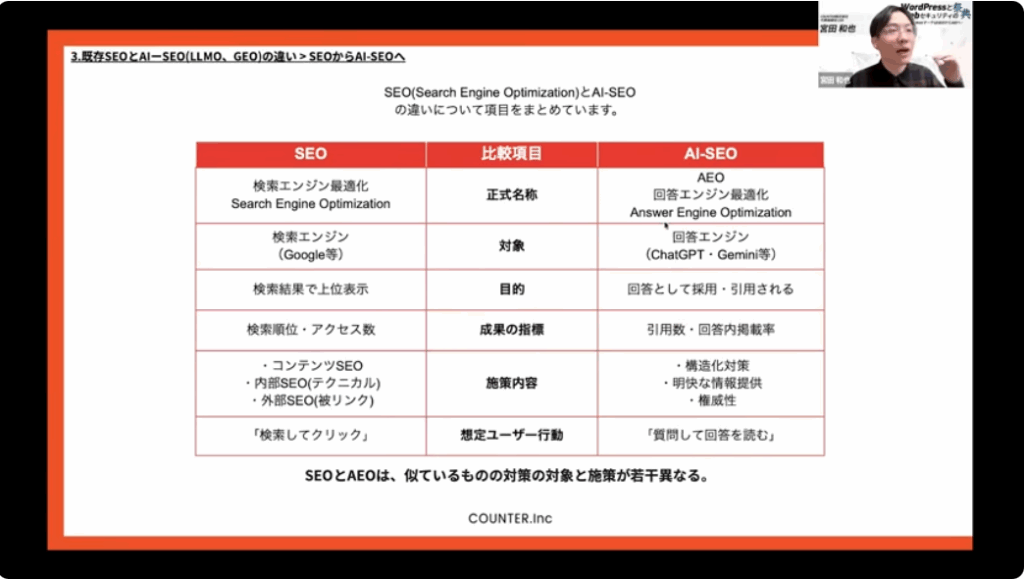 今回は、COUNTER株式会社 代表取締役 宮田和也氏が登壇したセミナー「新時代のSEO AI-SEOのポイント」をもとに、AI時代のSEO・コンテンツ発信の考え方を整理します。