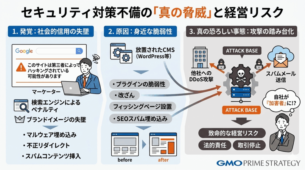 しかし、真に恐ろしいのは、自社サイトが知らぬ間に「攻撃の踏み台」にされてしまうことです。脆弱性を突かれ、他社へのDDoS攻撃やスパムメール送信の拠点として悪用されれば、自社が「加害者」となり、法的責任や取引停止という致命的な経営リスクを招きかねません。