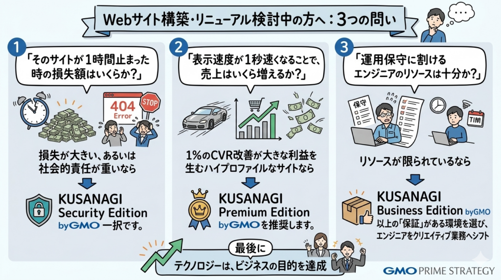 - ビジネスインパクト: 広告費を投じて集客しても、表示が遅ければ予算を捨てているのと同じです。KUSANAGI Premium Edition byGMOは、「UXを極限まで高め、広告の投資対効果(ROAS)を最大化したい」という戦略的な攻めのサイトに向いています。