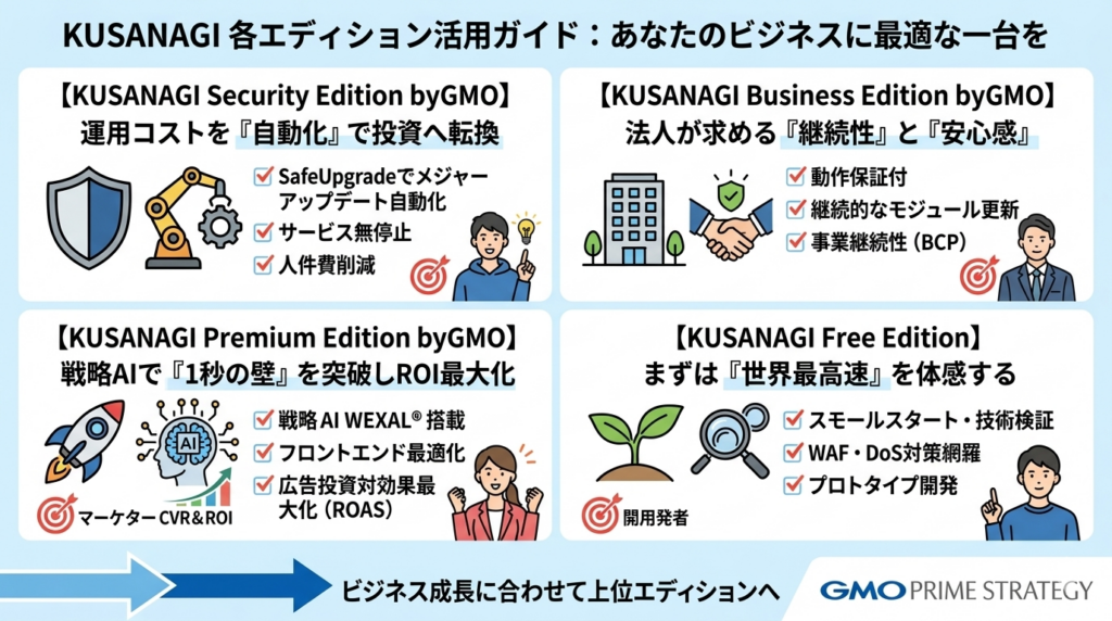 KUSANAGIには4つのエディションがありますが、これらを「松竹梅」のようなグレードとして捉えるのではなく、「今、何に最も投資すべきか」というニーズ起点で切り分けることが、プロジェクト成功の鍵となります。