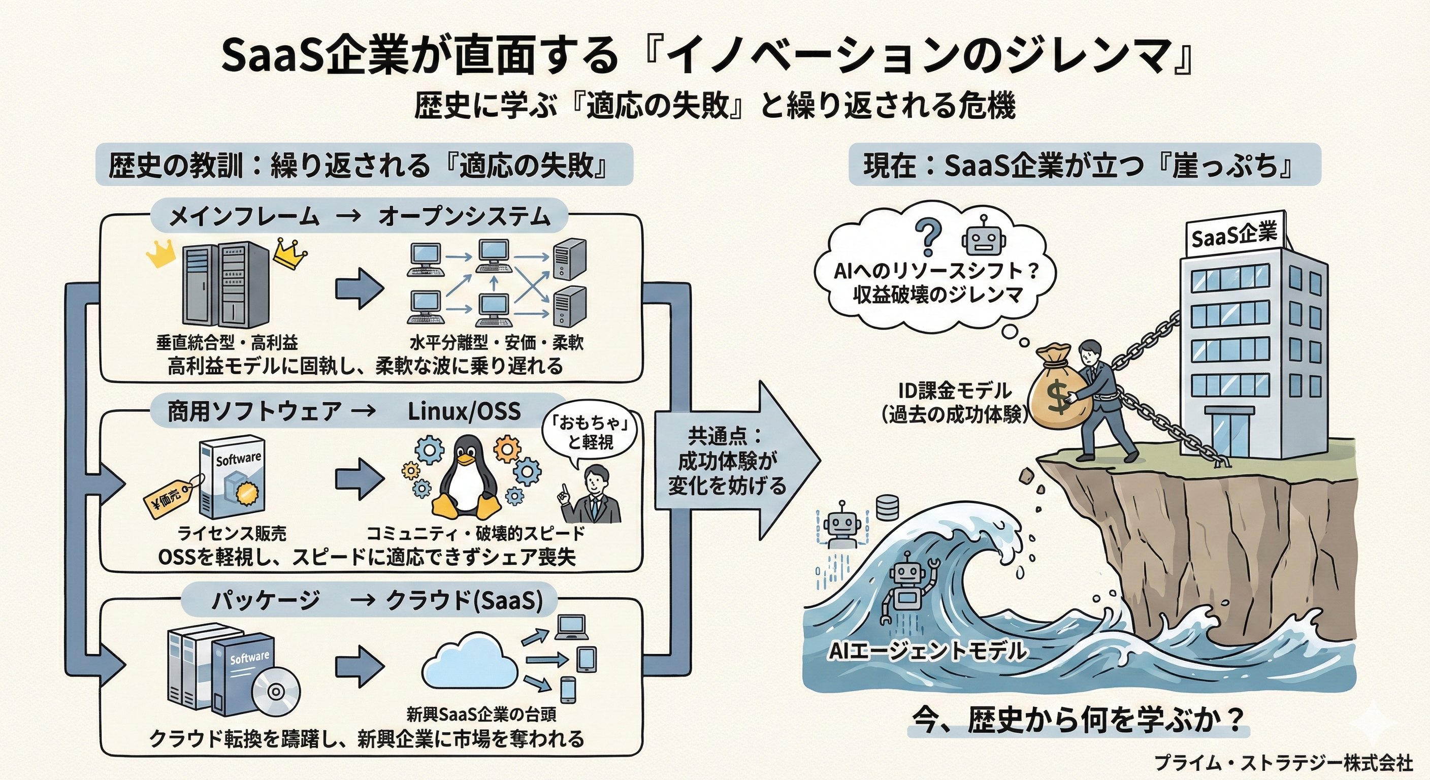 テクノロジーの転換点において、既存の王者が新しい波に飲み込まれる姿は、ITの歴史の中で何度も繰り返されてきました。今のSaaS企業が直面しているのは、まさにこの「イノベーションのジレンマ」です。