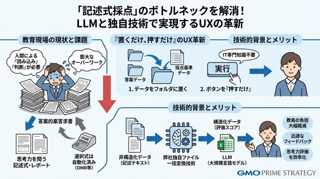 2026年3月2日に弊社が発表した「AI自動採点ソリューション」は、技術的にはLLM(大規模言語モデル)の推論能力を応用したものですが、マーケティング的視点で見れば、これは教育者の「付加価値の再定義」を支援するツールだと自負しています。