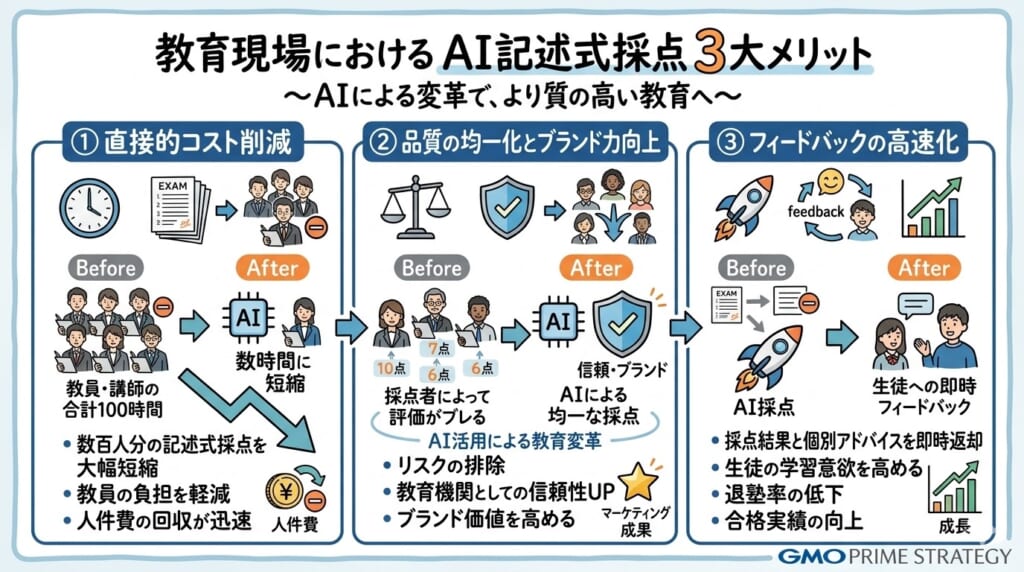 2. 品質の均一化とブランド力向上: 「採点者によって評価がブレる」というリスクを排除することは、教育機関としての信頼性(ブランド)に直結します。