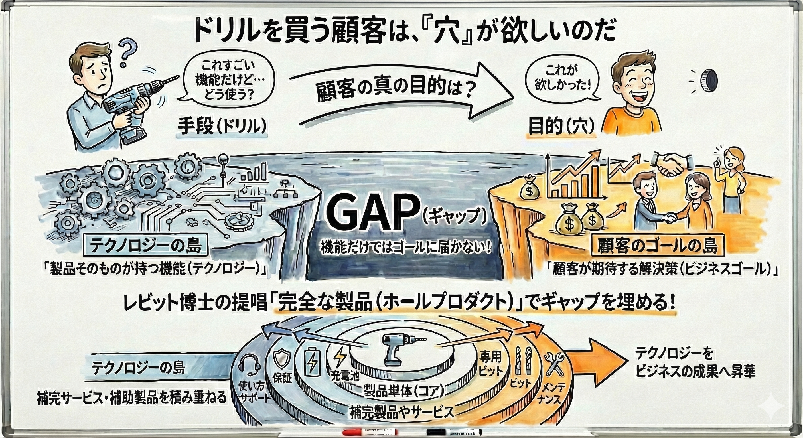 顧客がある製品を購入した際、そこには必ず「製品そのものが持つ機能(テクノロジー)」と「顧客が期待する解決策(ビジネスゴール)」との間にギャップが存在します。レビット博士は、製品単体(コア)だけではなく、そのギャップを埋めるための補完サービスや補助製品を層のように積み重ねていくことで、初めて顧客にとっての「完全な製品(ホールプロダクト)」になると説きました。