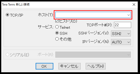 起動すると、「TeraTerm:新しい接続」という画面になりました。間違えないように情報を入力していきましょう!
