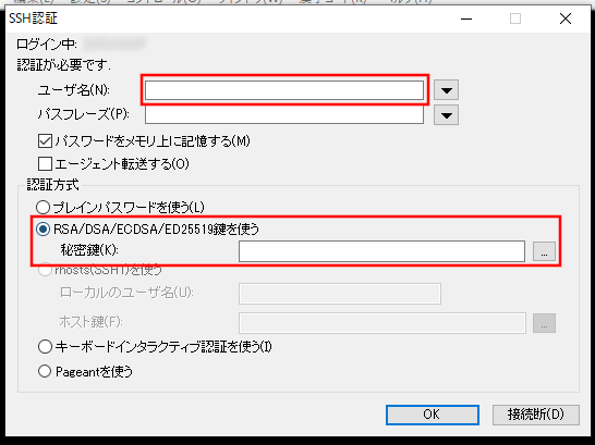 「認証方法」の項目は、2段目の「RSA/DSA/ECDSA/ED25519鍵を使う」を選択。