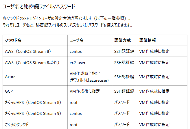 クラウドによってログインユーザー名が異なるので必ずチェック