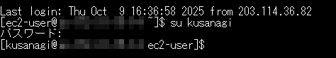 せっかくkusanagiユーザーができたので、rootユーザーからKUSANAGIユーザーに切り替えてみましょう。