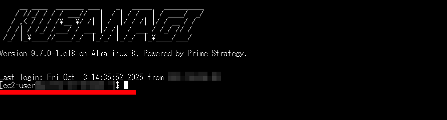 コマンド入力画面を見ていると、今は”ec2-user”になっていました。
