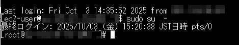 再度ログインしたら、rootユーザーに切り替えをしてください。