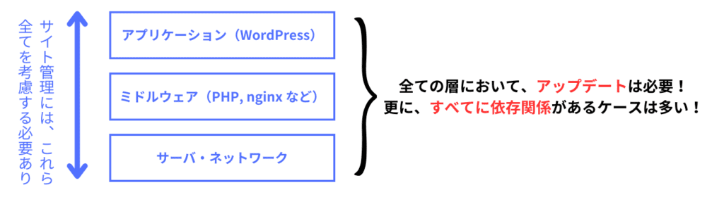 例えば、WordPressをアップデートしようとしても、使用しているPHPのバージョンが新しいWordPressのバージョンに対応していなければPHPも一緒に上げなくてはなりません。WordPressだけアップデートしたら動かなくなる可能性があります。さらに、それに伴って関連するミドルウェアもバージョンを上げなくてはならなくなった、、、ということはご支援している中でもよく起こる話です。