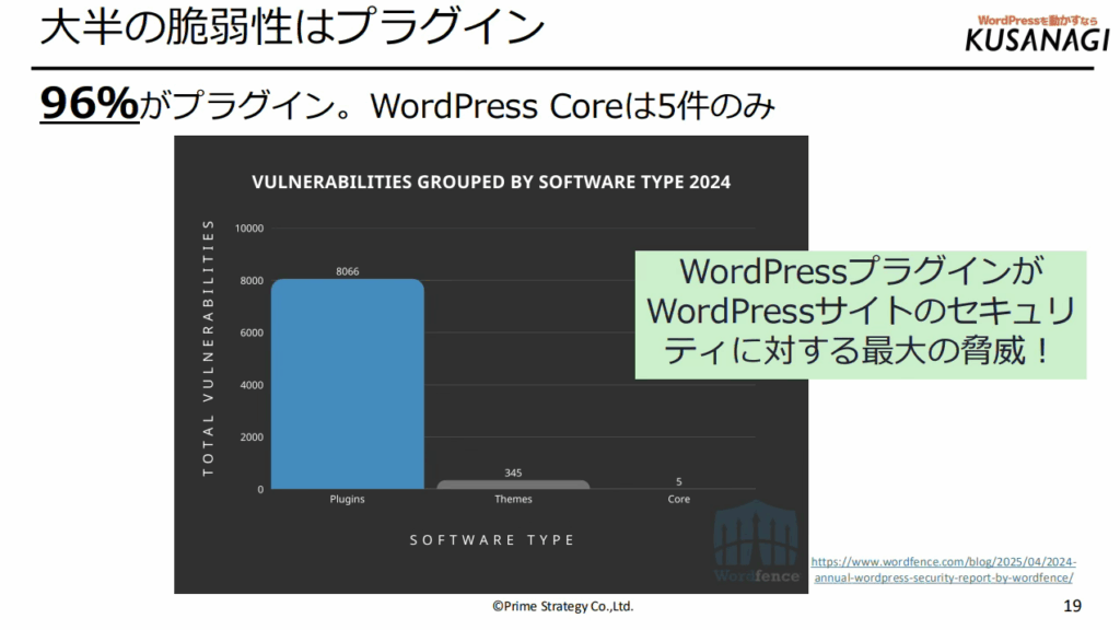 実は、WordPressに関連する脆弱性の96%がプラグイン起因であるというデータがあります。プラグインをしっかり管理していくことの重要性がわかります。