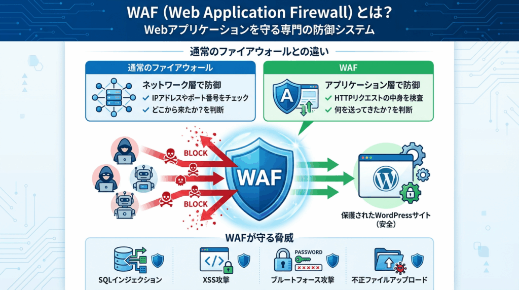 WAF(Web Application Firewall)は、WordPress本体やプラグインより「外側」で攻撃を遮断