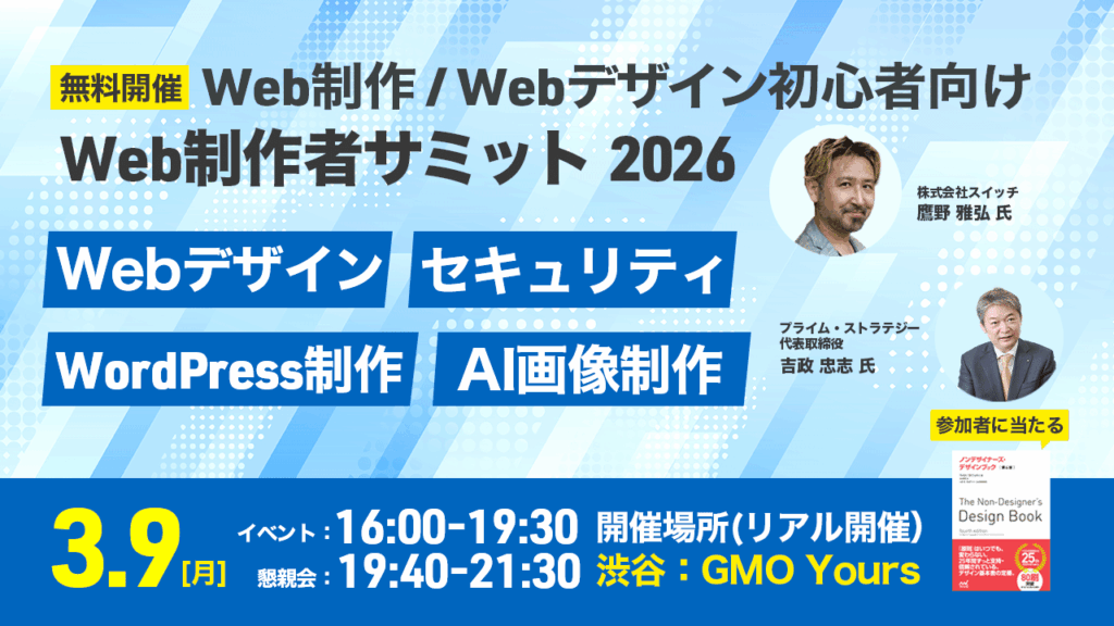対象の方:Web制作初心者/Webデザイナー初心者/デザイン業務をしている方/生成AIでの画像制作に興味がある方/WordPress制作初心者/Webセキュリティに興味がある方
