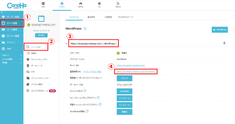管理画面に入る手順ですが、「①サイト管理⇒②サイト設定⇒③WordPressのURL⇒④管理画面URL」と順にクリックしていきます。