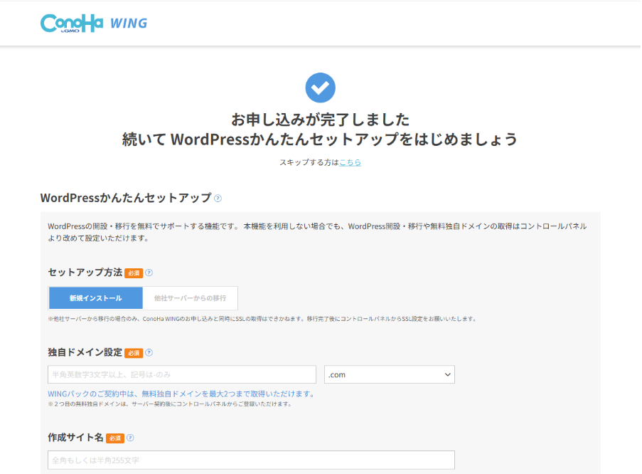 「ConoHaWING」では、WordPressかんたんセットアップという機能があり、ドメインやサイト名などを入力するだけで、WordPressの管理画面に入るための設定まで完了させることができます。