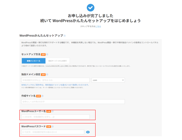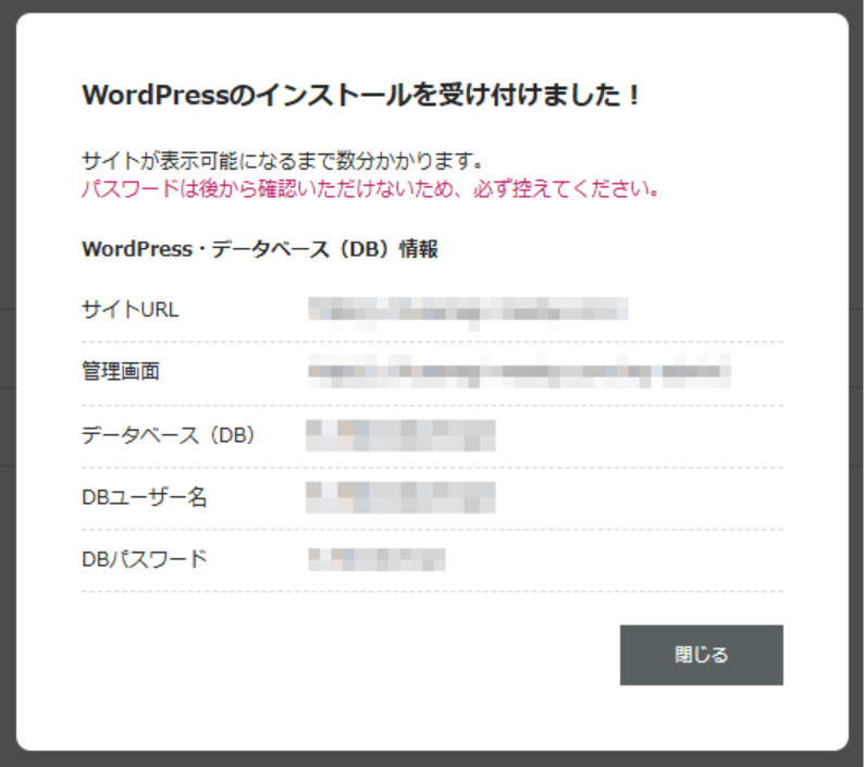 下部にある、WordPressユーザー名/パスワードは、WordPressの管理画面にログインするときに必要なので、忘れないように保存しておきましょう。