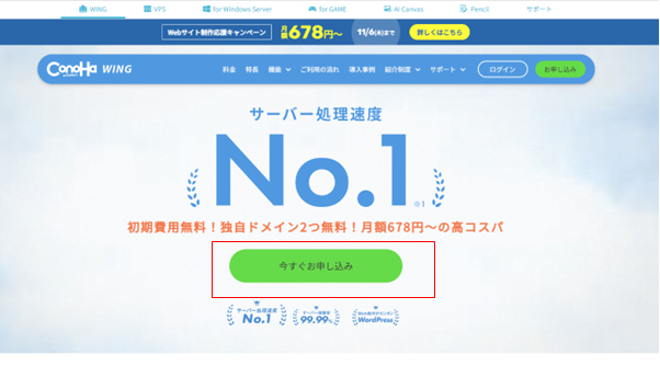 ConoHaWINGのサイトに行き、「今すぐお申込み」ボタンからアカウント作成を進めていきます。