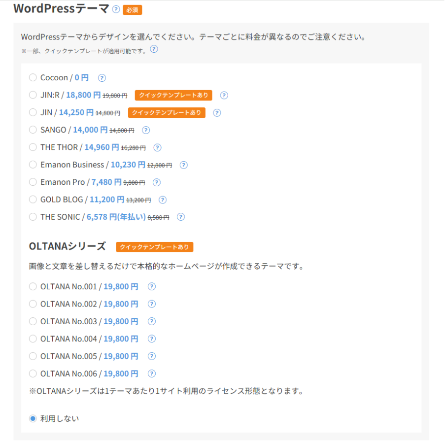 料金プランの設定が終わると、WordPressテーマや機能を選ぶ項目に入ります。