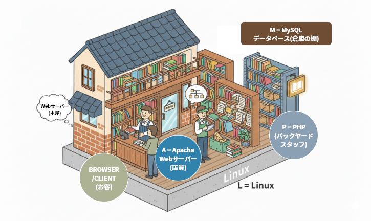 こうした仕組みを支える基本セットが「LAMP環境」です。