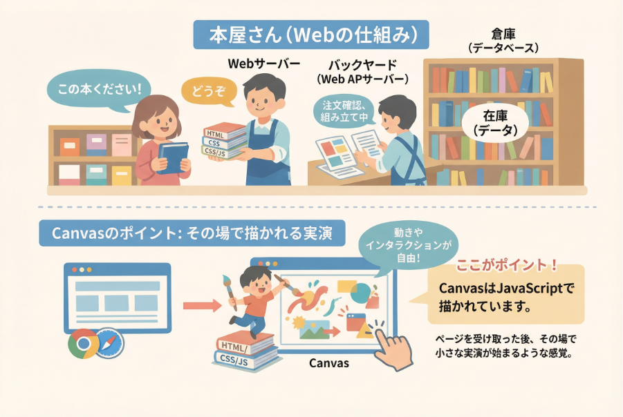 つまり、最初に店員さん(Webサーバー)からHTML・CSS・JavaScriptがまとめて渡され、その中のJavaScriptがブラウザ上で動き、Canvasという領域に直接グラフィックを描いていきます。