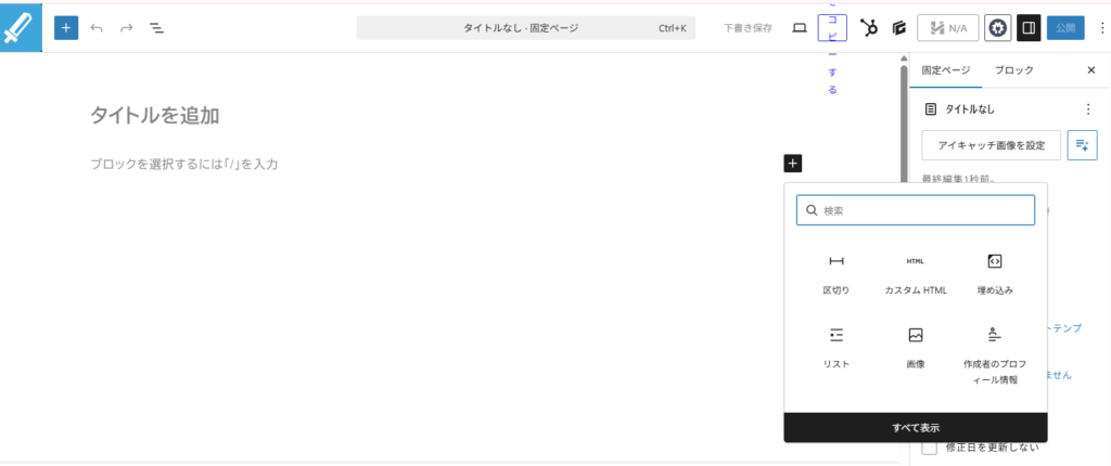 コードを貼り付ける場所は編集画面で「+」をクリックして表示されるブロックエディターで「カスタムHTML」をクリック。