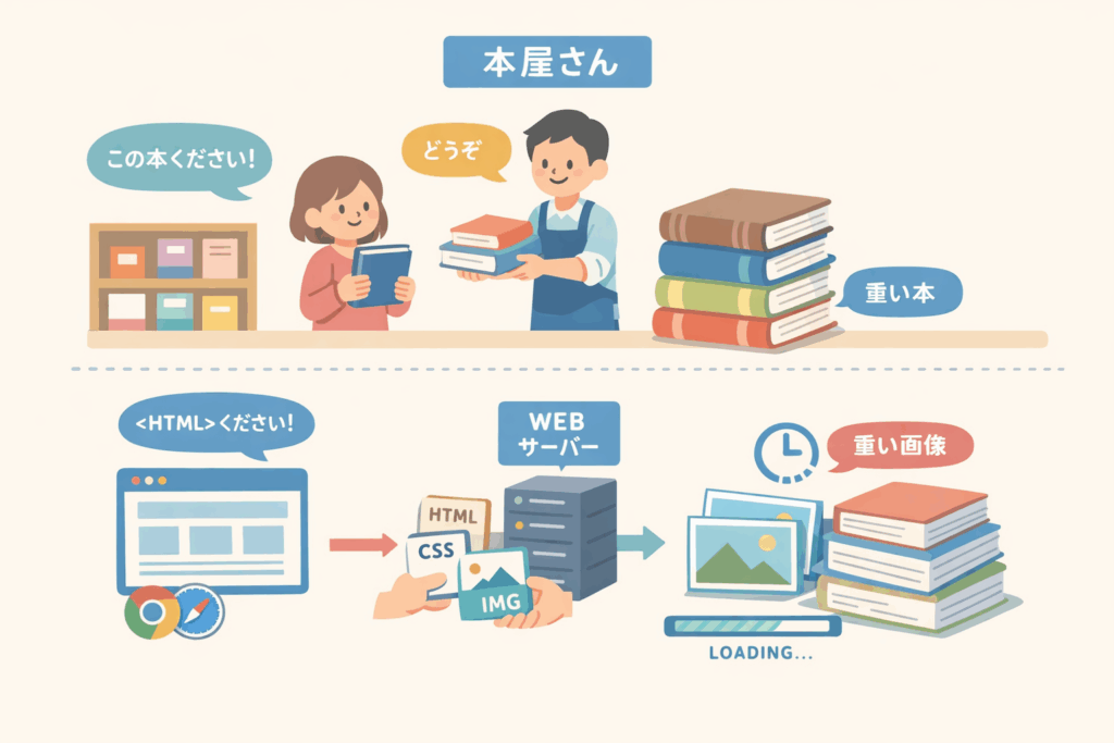 お客さん(ユーザー)が「この本(HTML)をください」と店員(サーバー)に頼むと、店員は本を渡します。