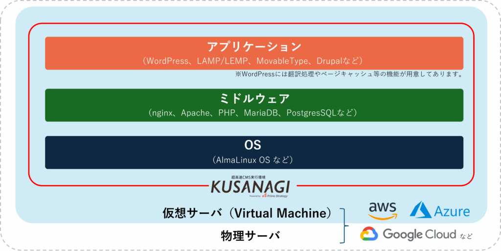 KUSANAGIは、WordPressを速く・安定して動かすための実行環境(サーバー側の土台)です。