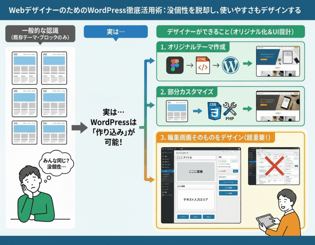ここが大事で、WebデザイナーにとってのWordPressは「見た目」だけじゃなく、更新する人が迷わないUIを設計できる という意味でも相性が良いんです。