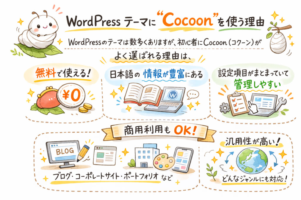 WordPressのテーマは数多くありますが、初心者にCocoon(コクーン)がよく選ばれる理由は、無料で使えること、日本語の情報が豊富にあること、設定項目がまとまっていて管理しやすいことが挙げられます。