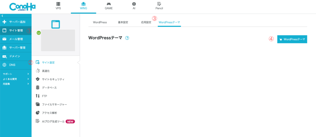 まずは管理画面にログインし、「①サイト管理→②サイト設定→③WordPressテーマ→④WordPress」の順に進んで行きましょう。