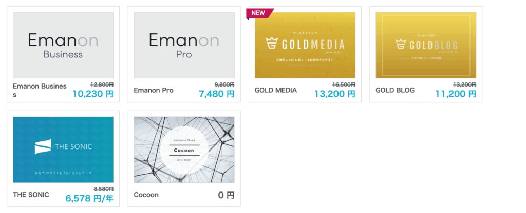 すると、テーマ購入の項目に行きますので、スクロールして「Cocoon」を選択します。
