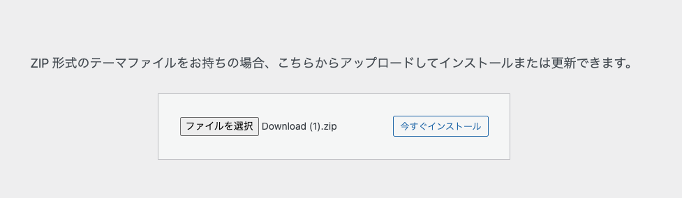 その後、上側にある、「テーマのアップロード」を選び、「ZIP形式のテーマファイルをお持ちの場合…」に先程ダウンロードしたファイルを格納します。