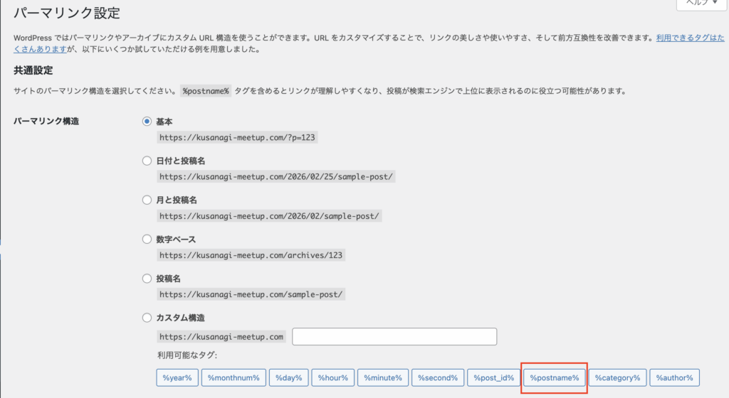 パーマリンクとは、各記事・ページに割り当てられるURLの形式のことです。後から変更すると、既存の記事URLが変わってしまうため、最初に決めておく必要があります。