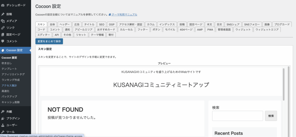- 「スキン」タブ:サイト全体の見た目の雰囲気を選べます。気に入ったものを1つ選んでおく程度で問題ありません